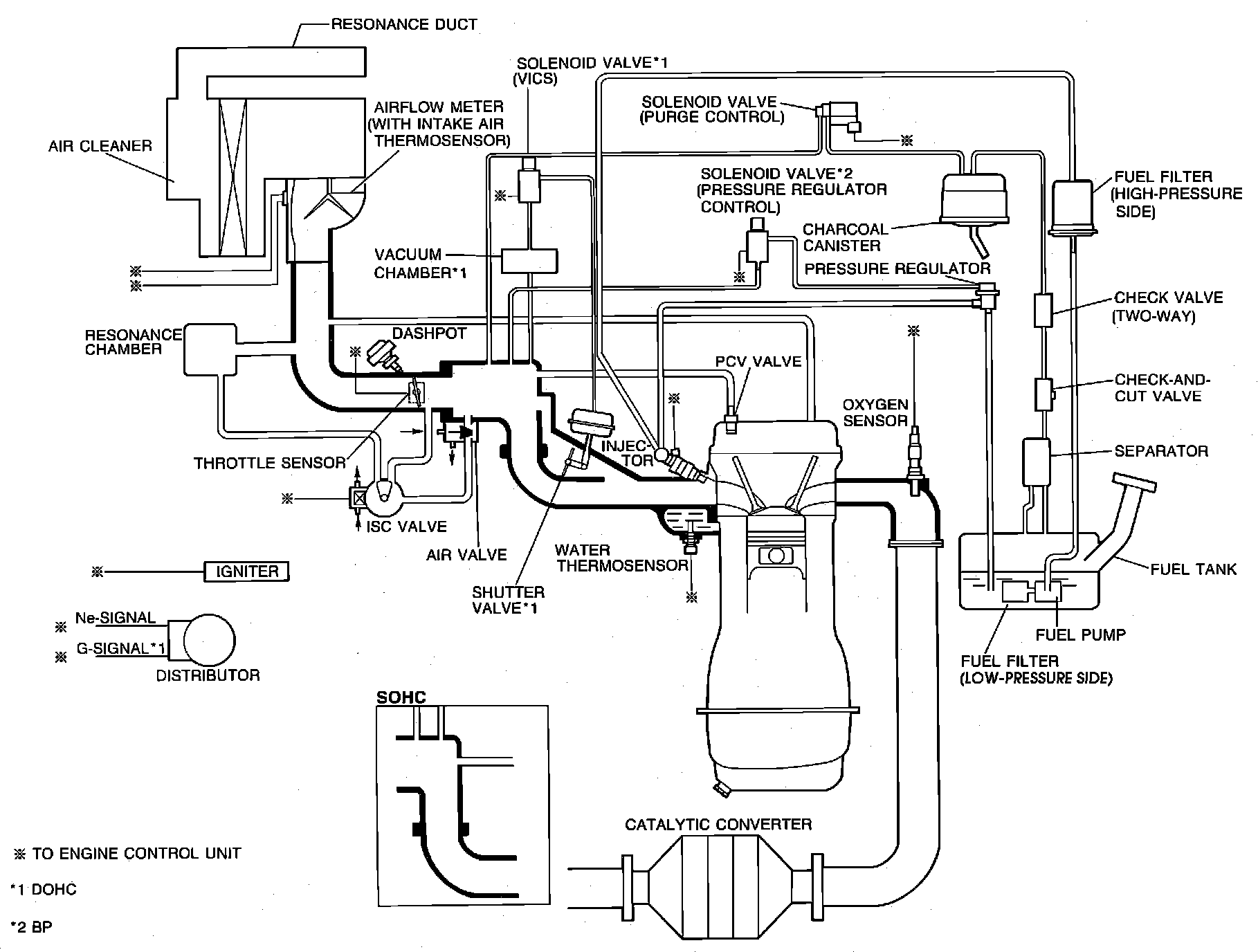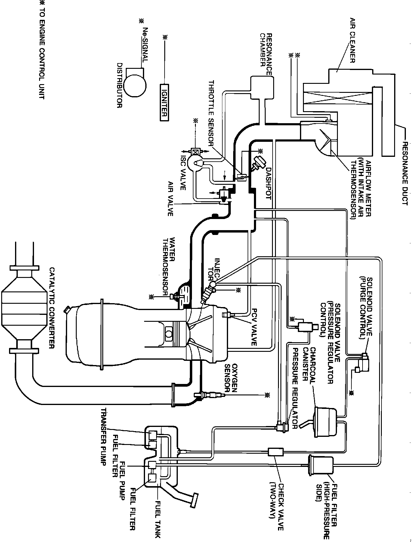 The ECU is a computer that judges air/fuel ratio as rich or lean according to a voltage signal generated by an oxygen sensor. Based on oxygen sensor and other input data, the ECU generates a controlling signal to the fuel injectors that regulates "ON" time. Because fuel pressure remains constant, the ECU controls air/fuel ratio adjustments by varying injector "ON" time.