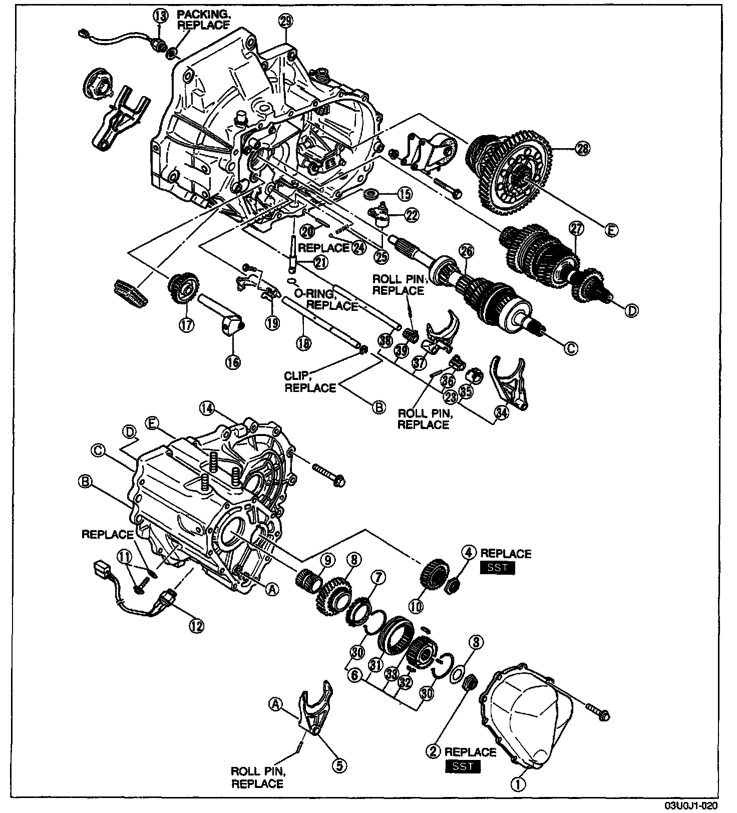 1. Remove the clutch hub assembly (1st/2nd), synchronizer ring (1st) and 1st gear with the SST.