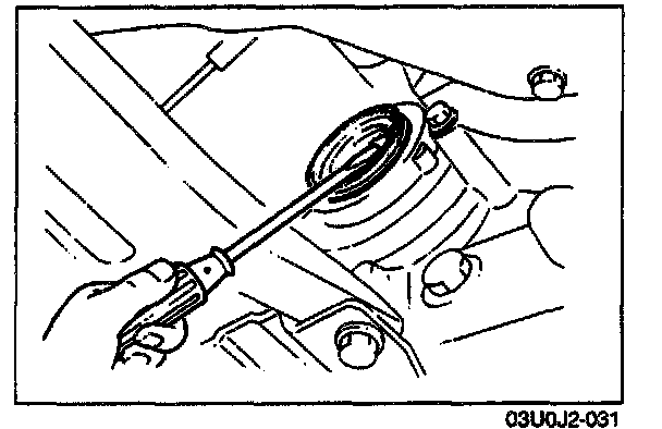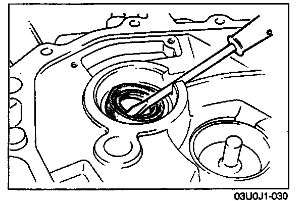 Jack up the vehicle and support it with safety stands. Drain the transaxle oil. Next, use the following procedure to replace the driveshaft oil seal: