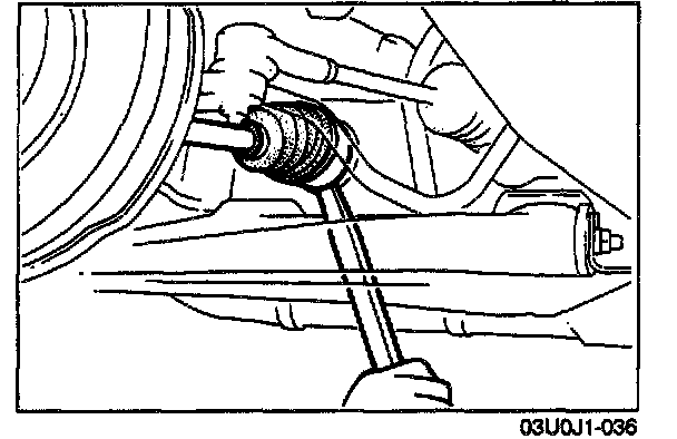 6. Disconnect the driveshaft from the transaxle by prying with a bar inserted between the outer ring and the transaxle.