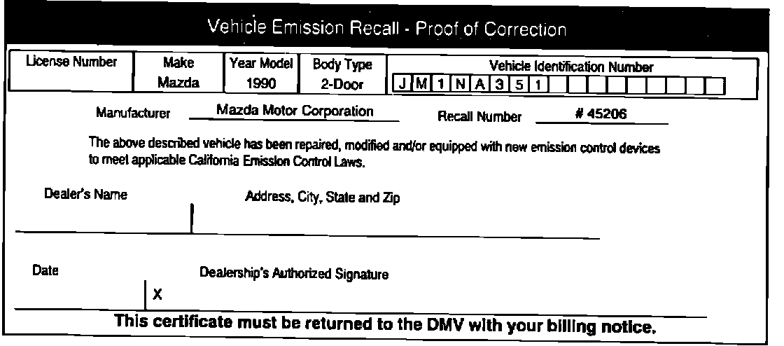 1. California dealers repairing vehicles after July 31, 1991 under an emission recall campaign are required to issue the owner a "Proof of Correction" certificate. See example. These certificates may be ordered free of charge by contacting the: