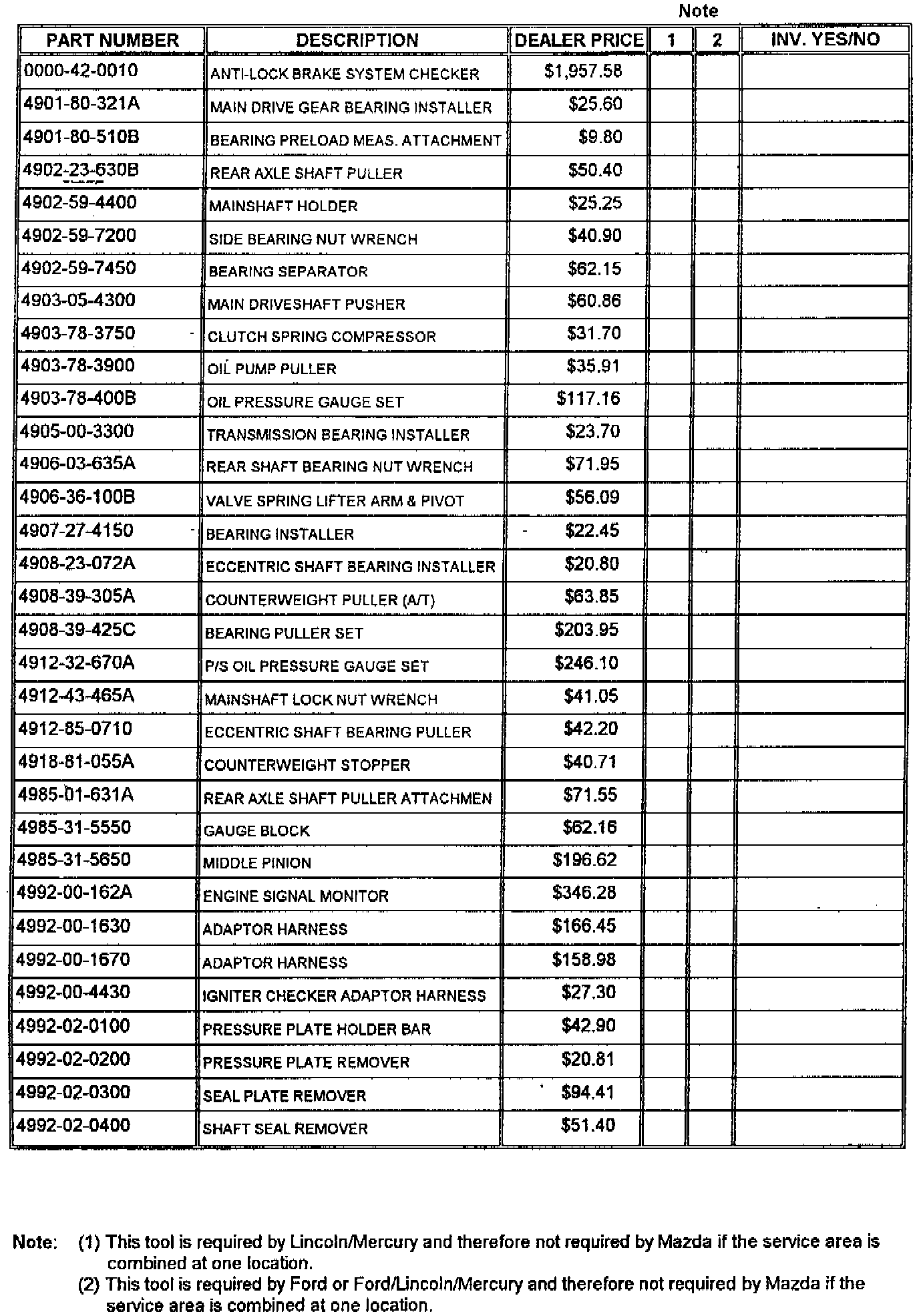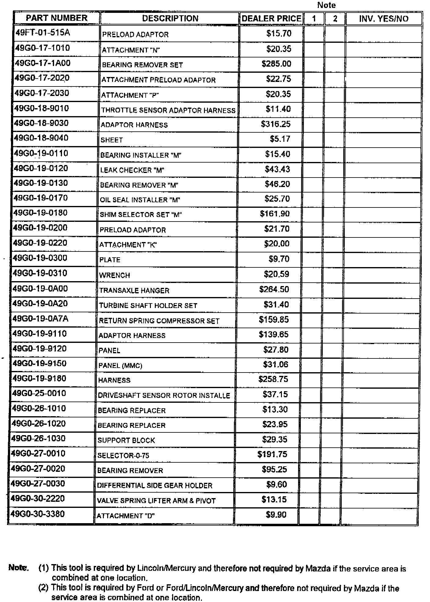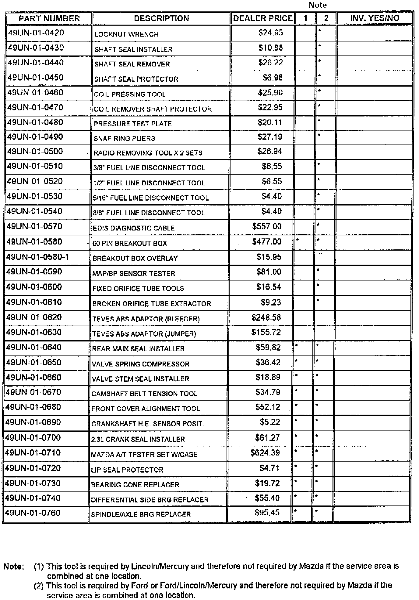 Updates will not include price changes. Prices are subject to change without notice. Use the toll free telephone numbers listed below ORDERING TOOLS" to contact America Kowa Seiki, Inc., Mazda's tool vendor, for current pricing.