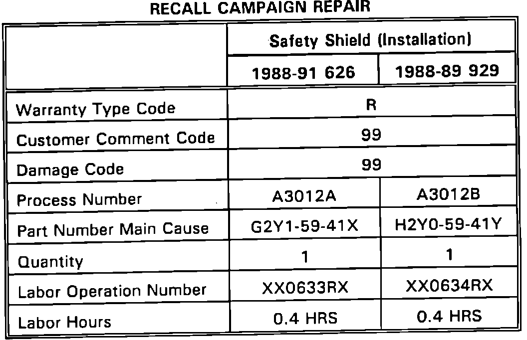 Mazda Motor Corporation has decided to conduct a Recall Campaign to install safety shields on certain 1988-91 626 & 1988-89 929 models beginning April 29, 1994.