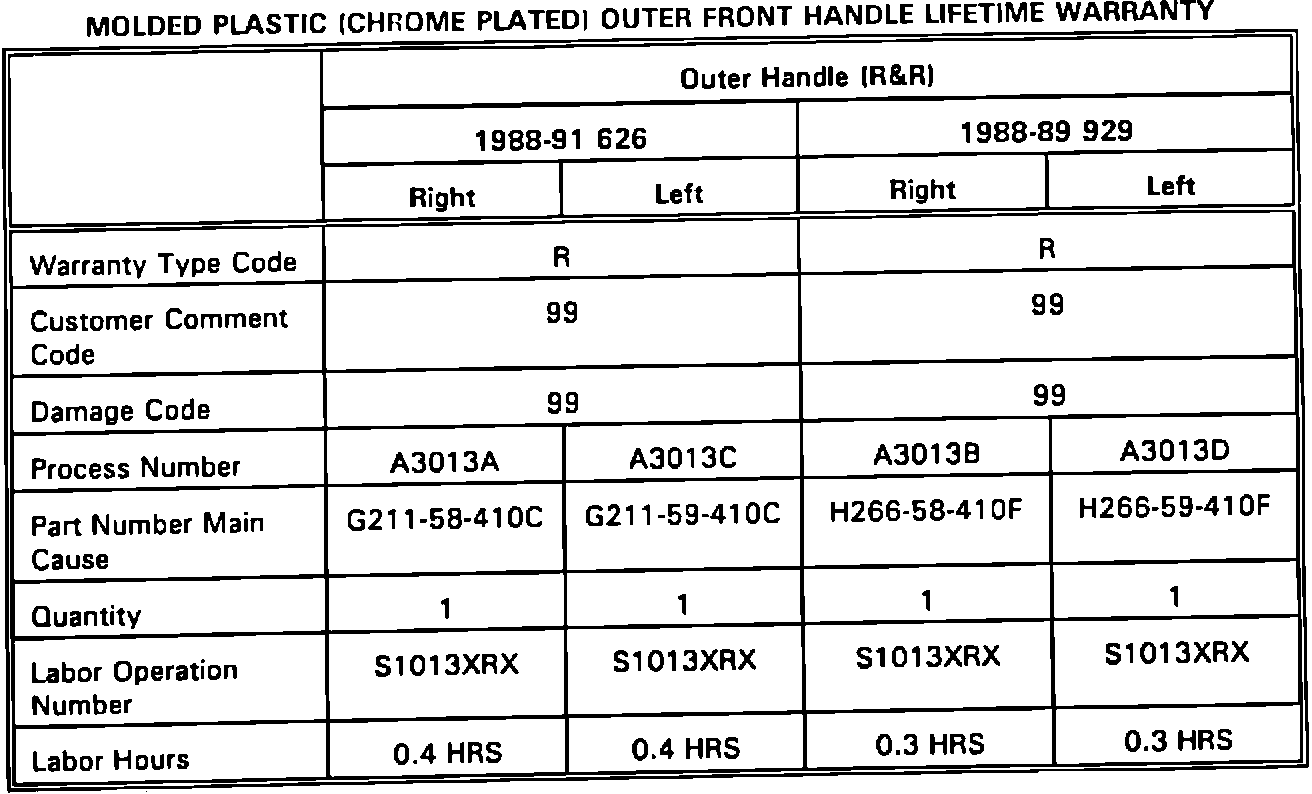 1. Only broken door handles due to a defect in materials or workmanship are covered by this warranty. Campaigning/Add-on replacement of both door handles will be subject to debit.