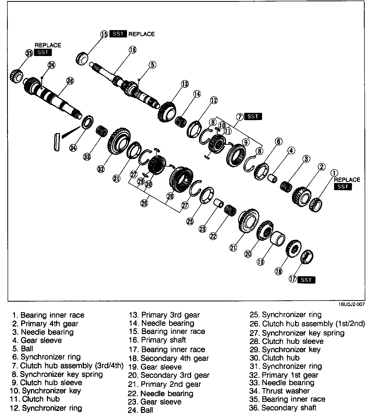 Remove the clutch hub assembly (1st/2nd) and 1st gear.