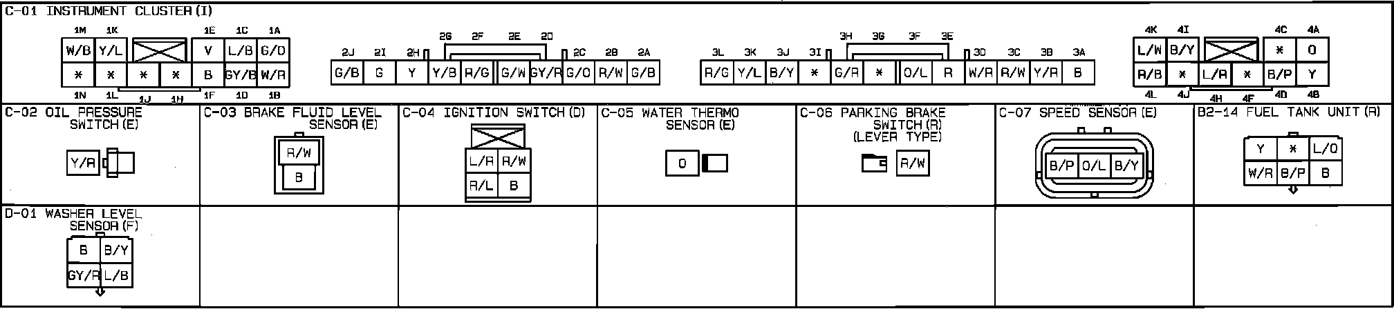 Instrument Cluster And Warning Lamps. DOHC. Temperature And Fuel Gauge. Tachometer. Fuel, Charge, Washer, Rear, Hi Beam, Oil, Abs, Brake, LH And Rh Turn, Belt, Door And Security Indicators. Connector Identification: