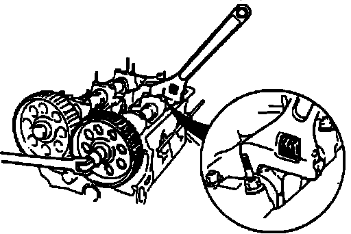 19. Using an adjustable wrench to hold camshafts as shown in Fig. 7, remove camshaft pulley lock bolts.
