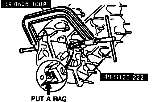 12. Holding drive plate in position with tool No. 49 H011 102 or equivalent, remove crankshaft pulley lockbolt.