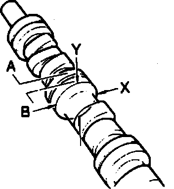 1. Set front and rear journals on V-blocks and check camshaft runout. If runout exceeds .0012 inch (.03mm), replace camshaft.