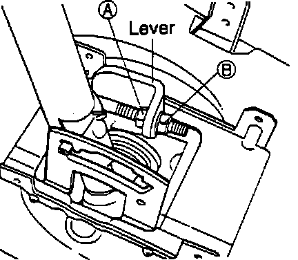 4. Using a feeler gauge, adjust gap between adjust lever and locknut ``A'' to .039 inch (1 mm), then remove gauge and torque locknuts to 69-95 inch lbs.