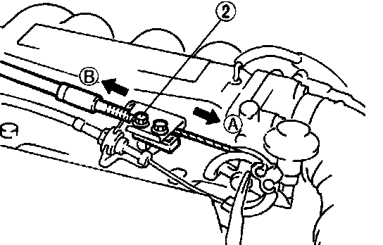6. Pull the throttle cable in the direction of arrow B until the line pressure exceeds the specified pressure.