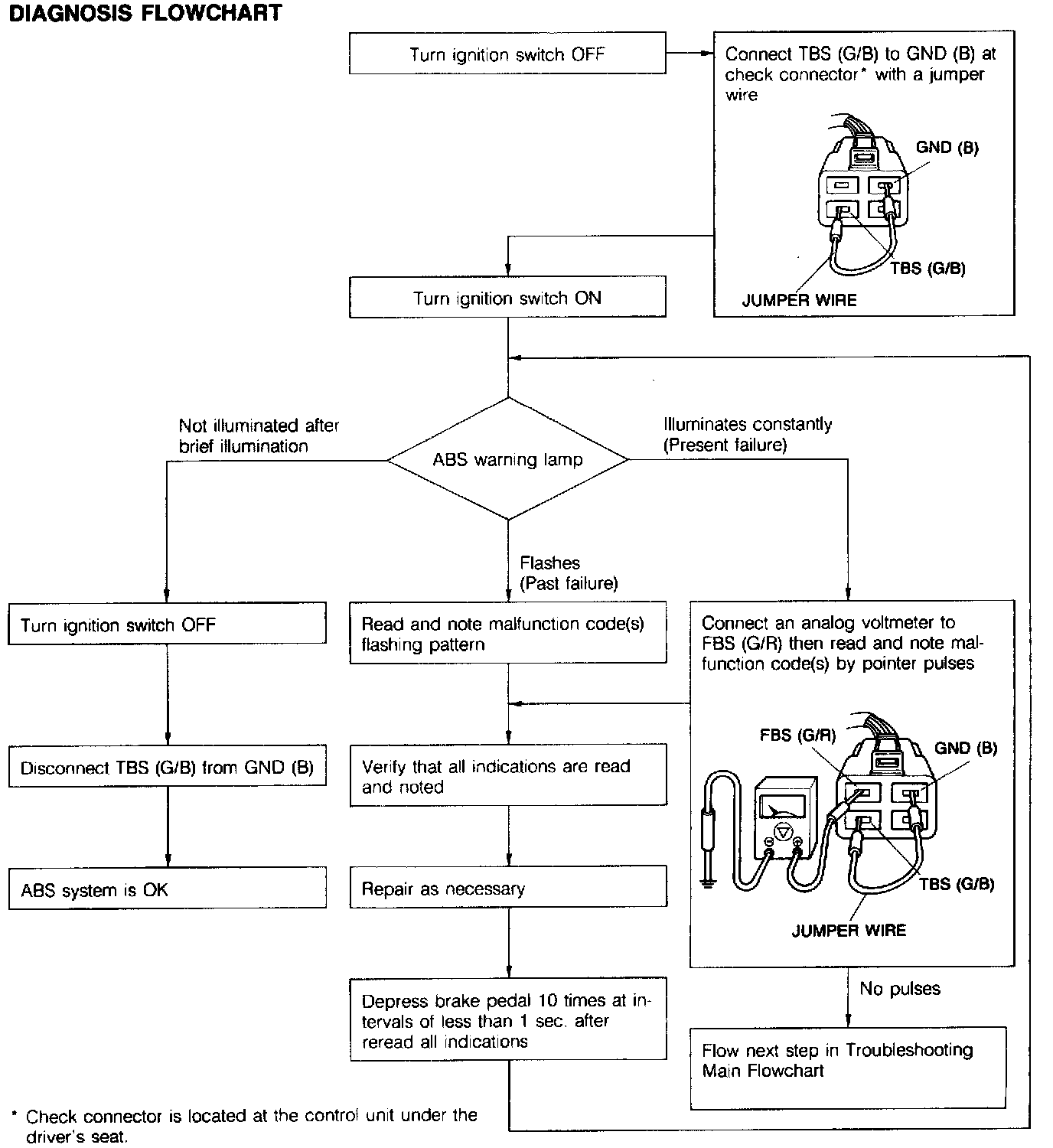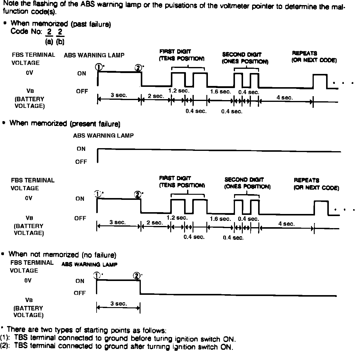 ^ If the ABS warning lamp starts flashing after the TBS terminal is grounded, it indicates a past failure and a malfunction code can be obtained by counting the flashing pattern or by connecting an analog voltmeter to the FBS terminal and counting the pulsations of the voltmeter pointer.