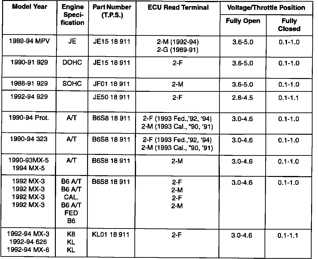 The following are revised procedures for inspection and adjustment of the throttle position sensor. DO NOT replace the throttle position sensor unless these instructions have been followed and the results indicate replacement. These instructions are consistent for all of the above models. Please make your shop personnel aware of this change by copying and distributing this bulletin. Due to the quantity of workshop manuals involved, revisions will be made as reprinting occurs.