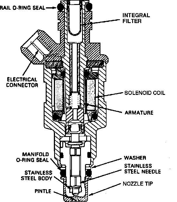 The injectors are constructed of stainless steel and high density plastic, to resist corrosion. They consist of a fuel inlet with filter screen, an electrical solenoid and connector, and a pintle valve and nozzle. Injectors are held in place by the fuel rail and sealed by an O-ring and insulator.