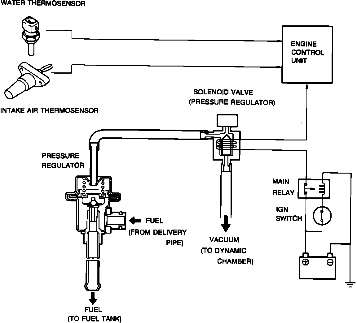 The PRC system raises fuel pressure to prevent fuel percolation during hot engine restart. Under specified conditions, the ECU closes the solenoid valve to block vacuum to the fuel pressure regulator. This raises fuel pressure by allowing the pressure regulator to control fuel pressure without vacuum modulation.