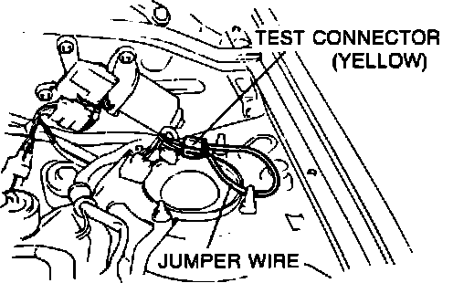 3. Energize fuel pump by bridging terminals of yellow fuel pump test connector (located near firewall below windshield wiper motor) and turning ignition "ON" .