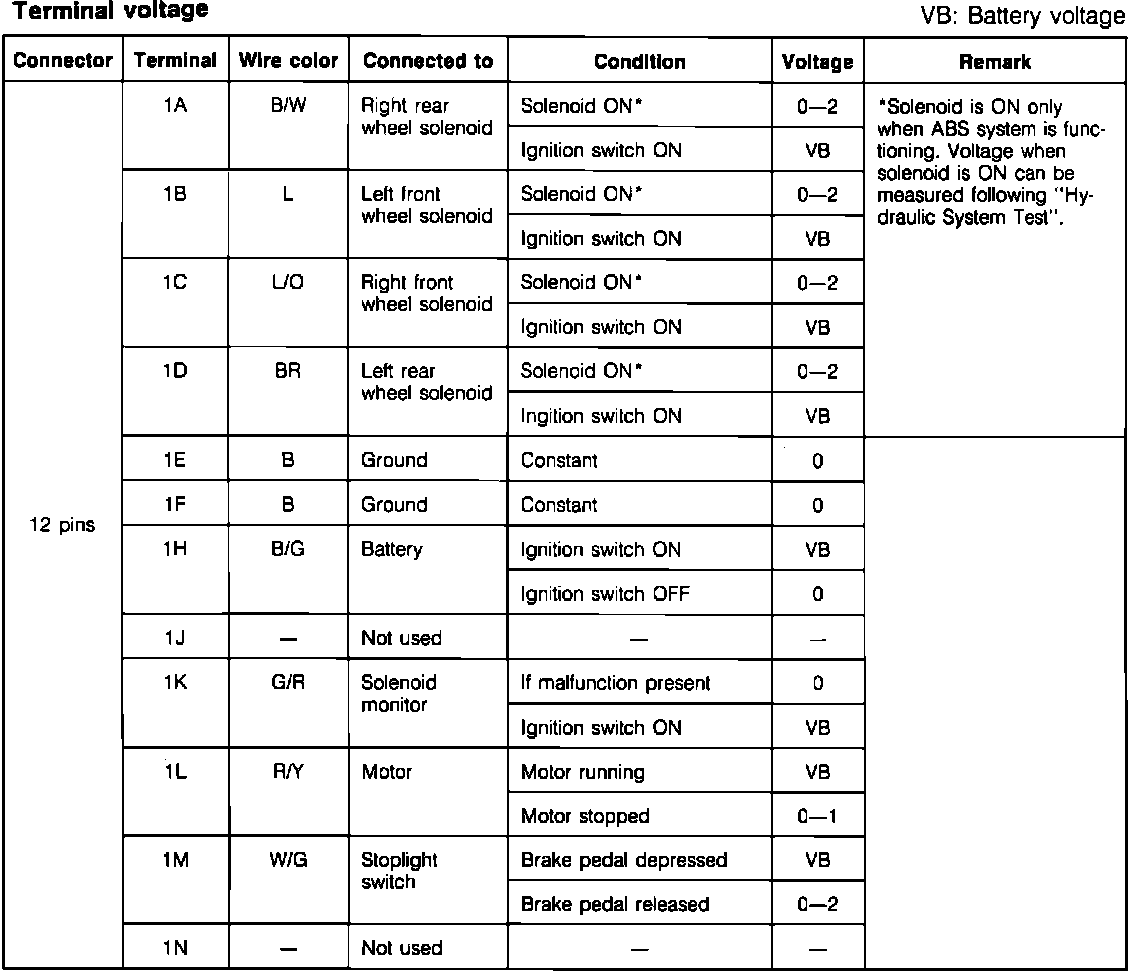 Anti-Lock Brakes. ECU Pin Voltage Chart: