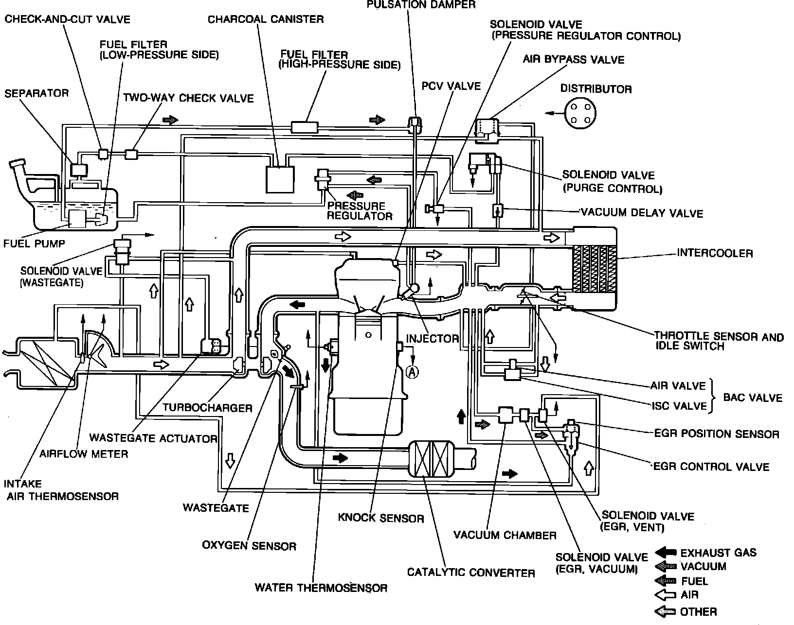 Vehicle is equipped with a turbocharged 2.2L 4 cylinder gasoline engine and computer controlled electronic fuel injection system. System maintains an air/fuel mixture as close as possible to ideal stoichiometric ratio, for all operating conditions. Fuel is supplied to injectors at high pressure by an in-tank electric fuel pump. The computer monitors various engine mounted sensors, including an exhaust gas oxygen sensor, and uses this information to determine quantity of fuel needed. The computer energizes injectors for varying lengths of time, depending on amount of fuel required.