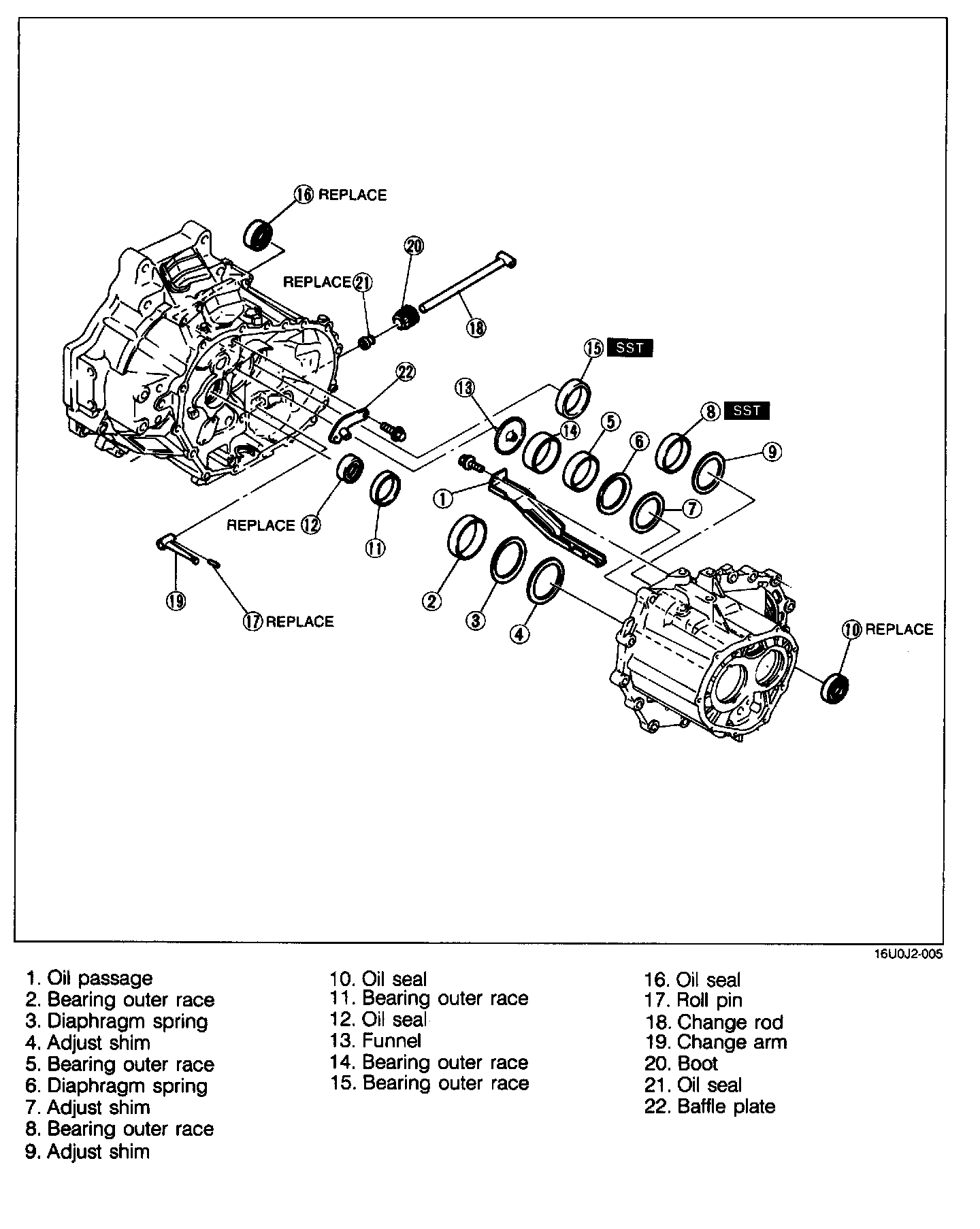 2. If the clearance exceeds the maximum, check the contact surfaces of 5th gear and the clutch hub. Replace worn or damaged parts.