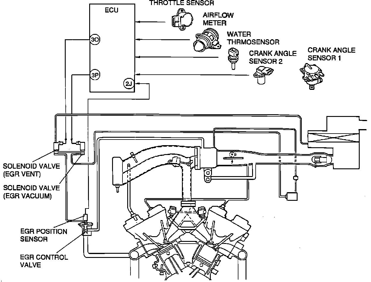 EGR system introduces exhaust gas into the intake manifold to reduce NOx emissions. System operates depending on engine load, engine speed, and coolant temperature.