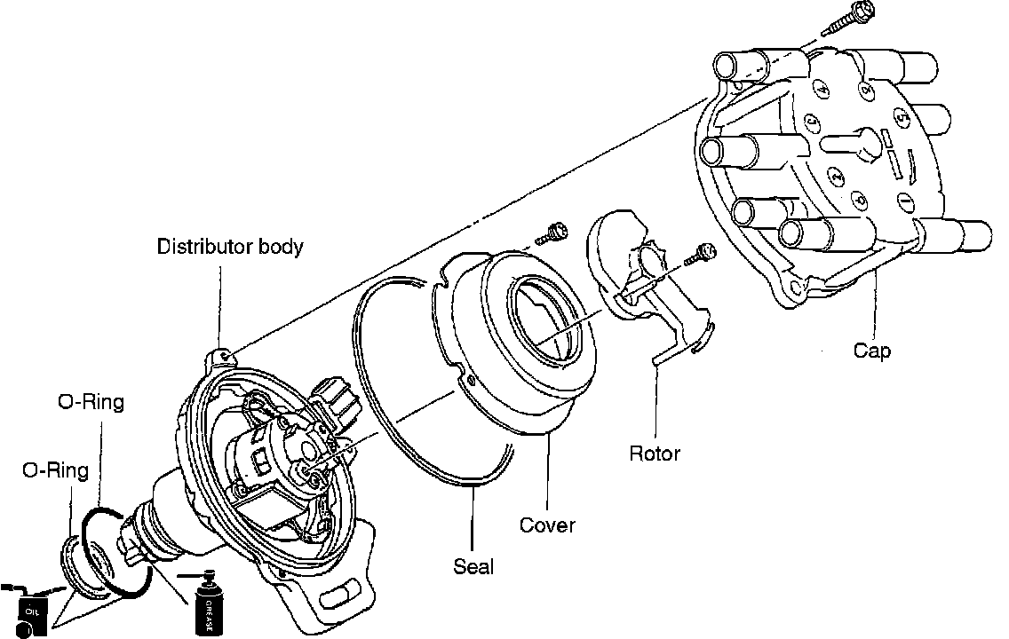 Distributor contains a trigger wheel that turns with the distributor shaft, and a stationary pick-up assembly. As the wheel rotates past the pick-up, signals are generated and interpreted by the ECU to determine crank angle (#1 cylinder TDC) and engine rpm. To calculate ignition timing, the ECU uses this input together with several others related to vehicle operating conditions. Except for the initial setting (basic distributor installed position), ignition timing is ECU controlled.