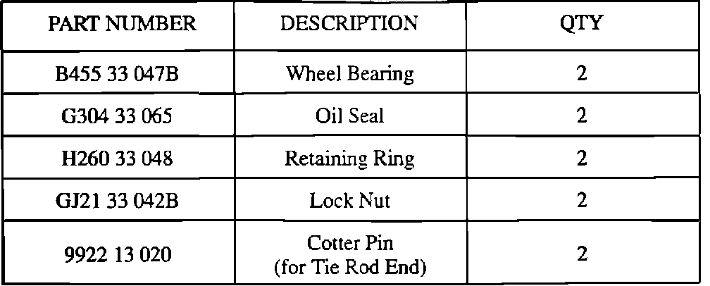 The wheel bearings have been modified to eliminate the excessive clearance. There is now a better, tighter fit between the wheel bearing and steering knuckle.