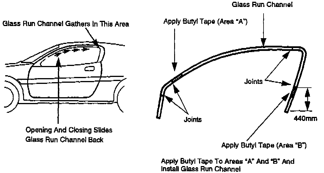 If the glass run channel is broken, Install a new part using butyl tape as shown.