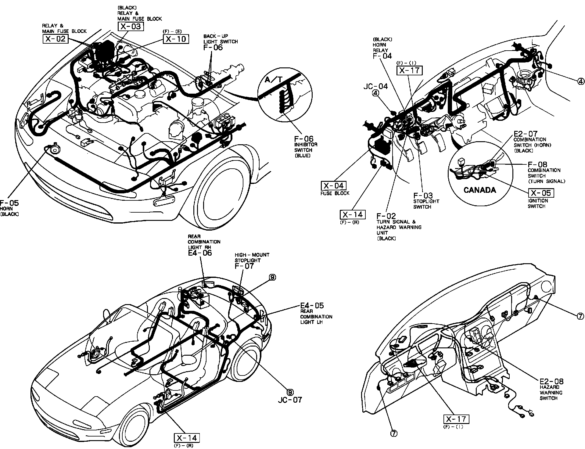 Back-Up, Horn, Turn, Hazard, Stop And High Mount Stoplights. Canada. Harness And Connector Locations: