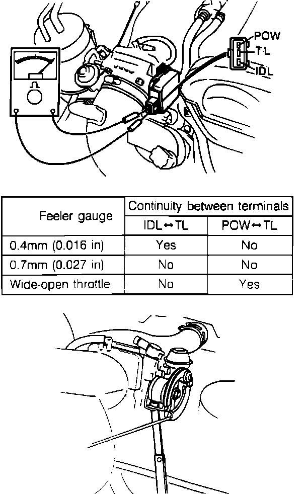 2. Check continuity between terminals with appropriate feeler gauge inserted between throttle stop screw and stop lever as described on image chart.