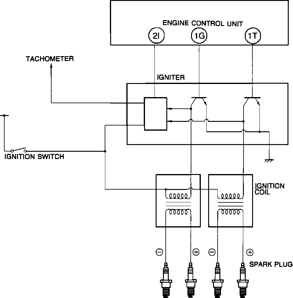 This vehicle is equipped with a distributorless ignition system. The Igniter, located on the right side inner fender, is a switching device that activates the primary ignition coil circuit. The ECU determines optimum ignition timing from various inputs and transmits a primary current "OFF" signal to the igniter to control ignition timing.