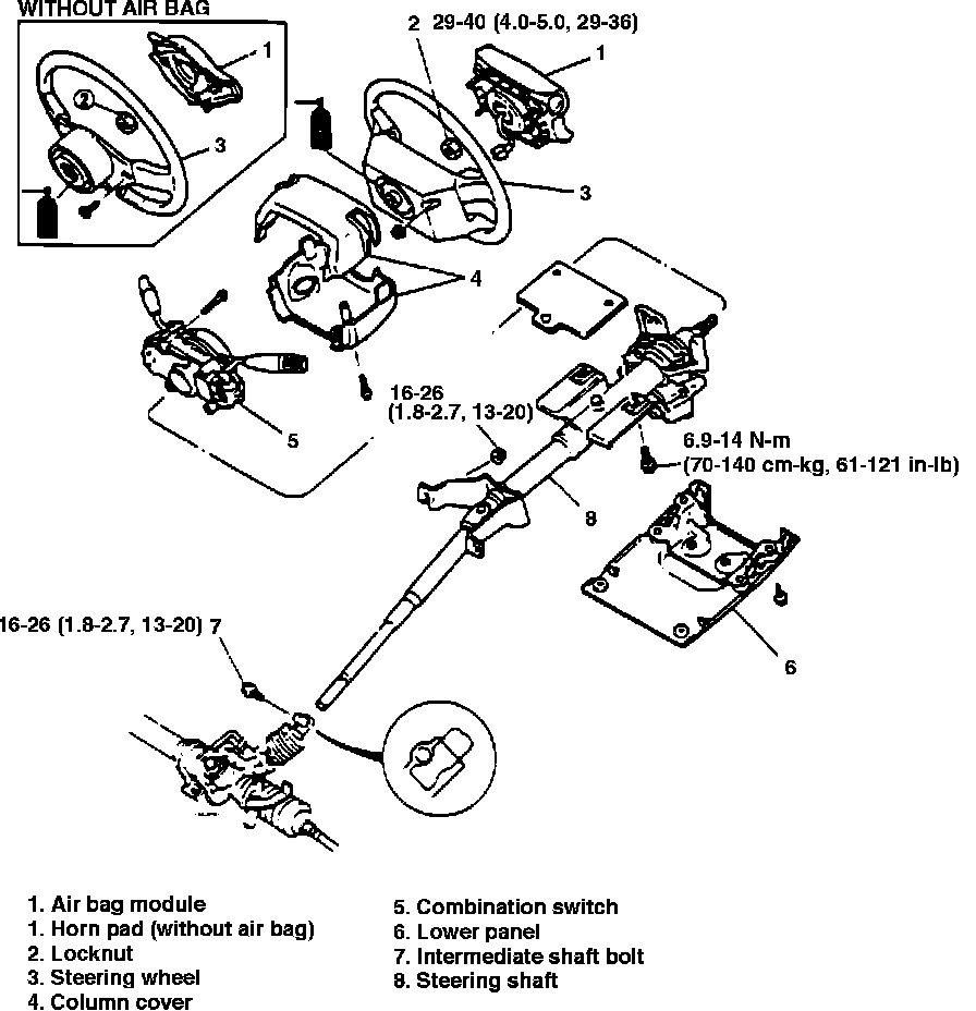 Refer to Fig. 11 when performing steering column service. On Miata, follow airbag disarming and arming procedures, refer to Air Bags and Seat Belts/Air Bags (Supplemental Restraint Systems)/Service and Repair.