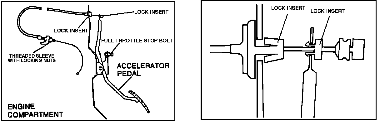 3. Check that throttle opens completely when accelerator pedal is depressed all the way to its stop. If not, or if throttle reaches wide open before pedal reaches the stop, loosen lock nuts and adjust full throttle stop bolt. Lock bolt in place when proper adjustment is obtained.