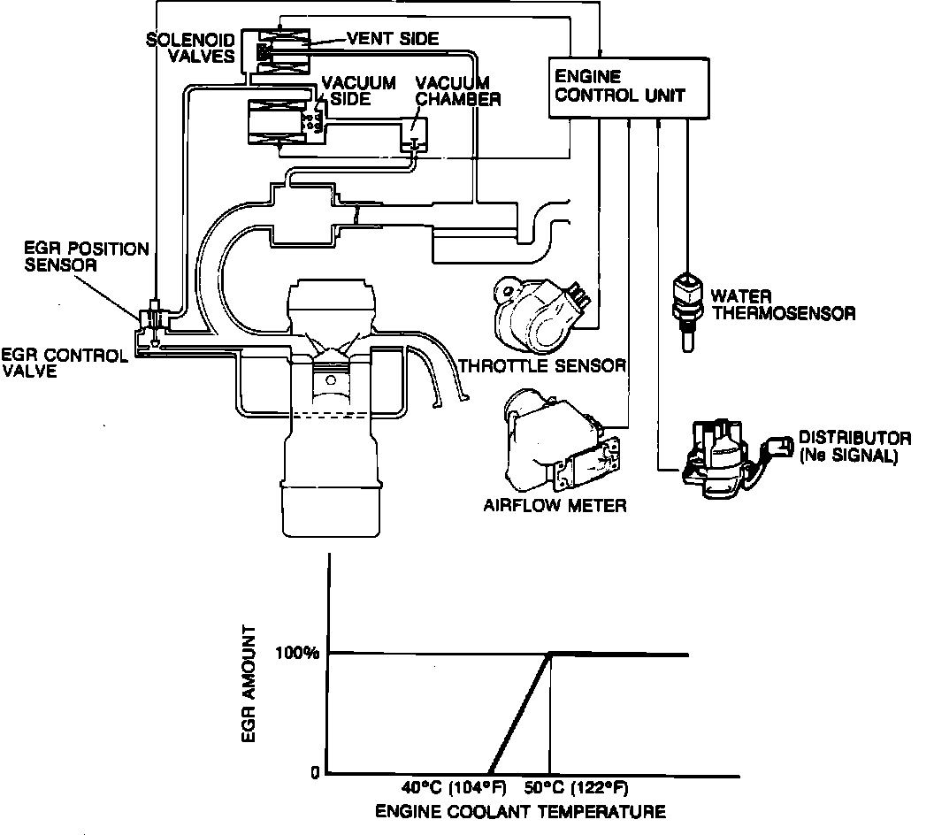 The engine control unit monitors signals from the distributor (engine speed), air flow sensor and throttle position sensor (engine load), and coolant temperature sensor. The ECU uses this information to determine when to allow EGR system operation and energizes the EGR vacuum or vent solenoid valves accordingly.