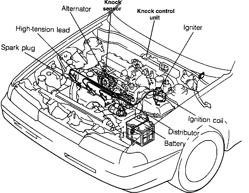 An ECU controlled igniter is used as a switch to regulate current flow through the coil primary circuit. Each time current flow is interrupted, high voltage is induced to fire the spark plugs. Except for the initial setting, timing is determined by the ECU. A knock control system consisting of a knock sensor and knock control unit signal the ECU to retard timing when detonation is detected.