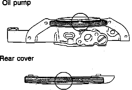 c. Install gaskets onto oil pump body and rear cover with projections in notches, Fig. 104.