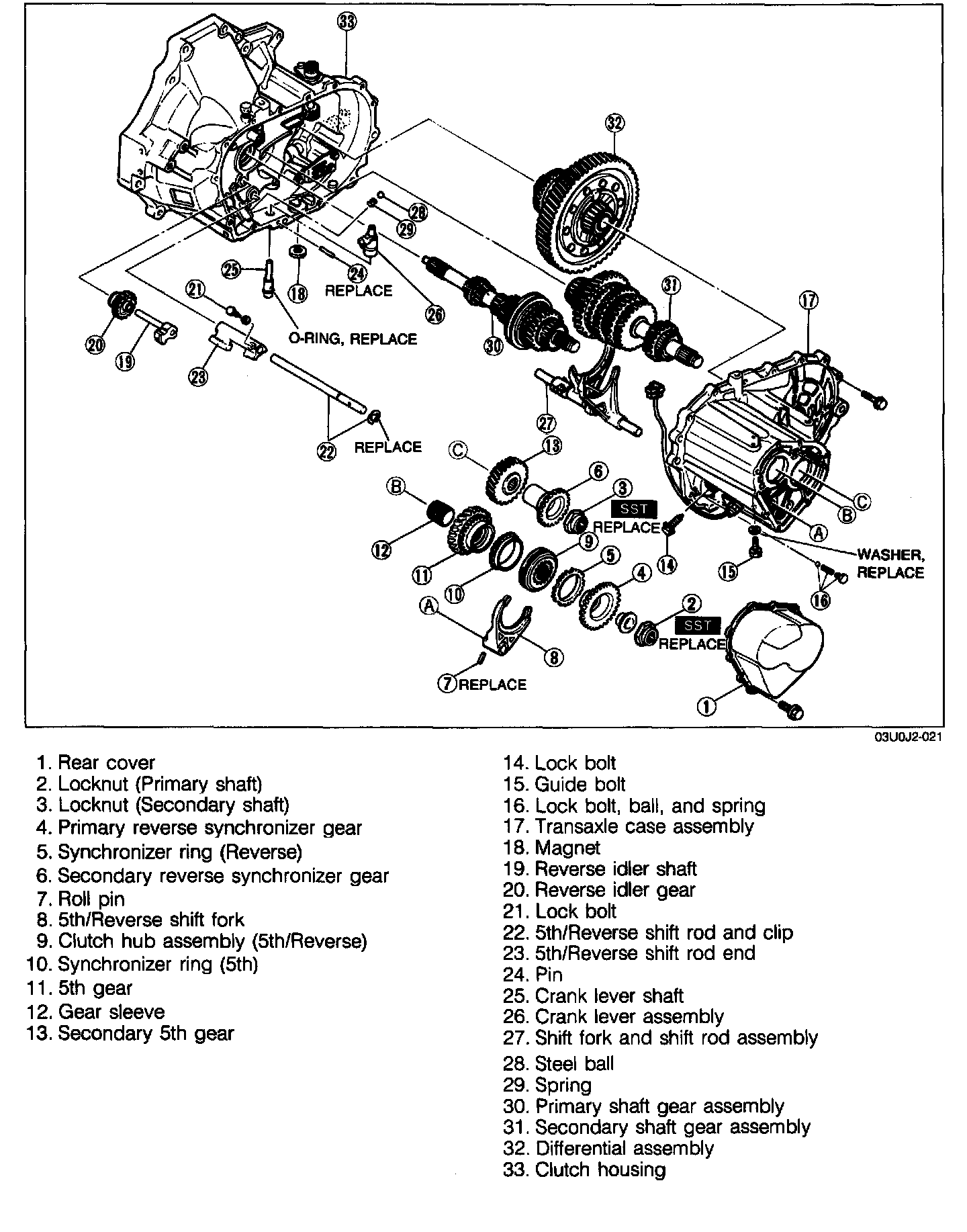 2. if the clearance exceeds the maximum, check the contact surfaces of 5th gear and the clutch hub. Replace worn or damaged parts.