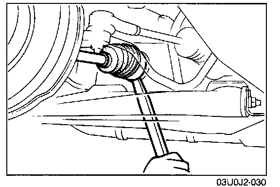 6. Disconnect the driveshaft from the transaxle by prying with a bar between the outer ring and the transaxle.
