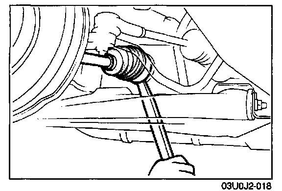 1. Separate the driveshaft from the transaxle by prying with a bar inserted between the outer ring and the transaxle.