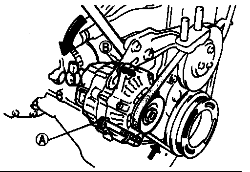 1. Loosen the alternator mounting bolt �and adjusting lock bolt (B).