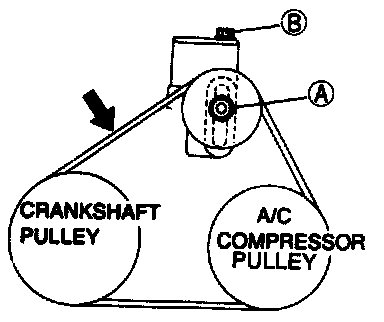 2. Adjust the belt tension by turning the adjusting bolt (B).