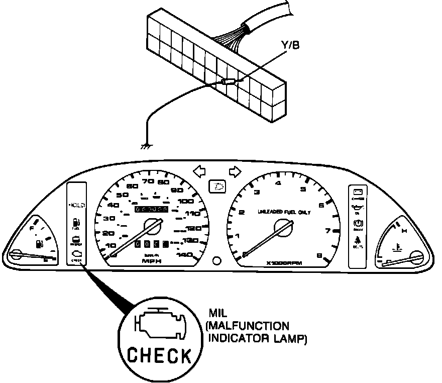MIL output voltage can be checked at ECU. With lamp "ON," voltage should be below 2.5V. With lamp "OFF," voltage should be approximately 12V.