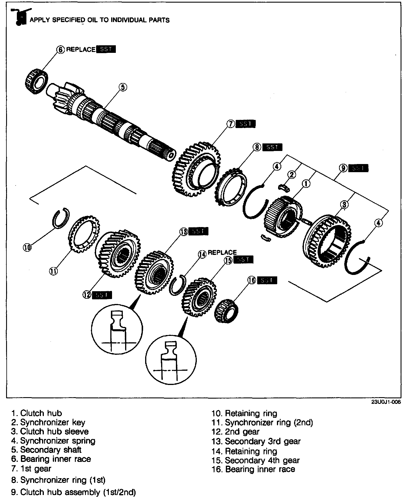 1. Install the synchronizer ring (2nd), 2nd gear, and secondary 3rd gear with the SST.