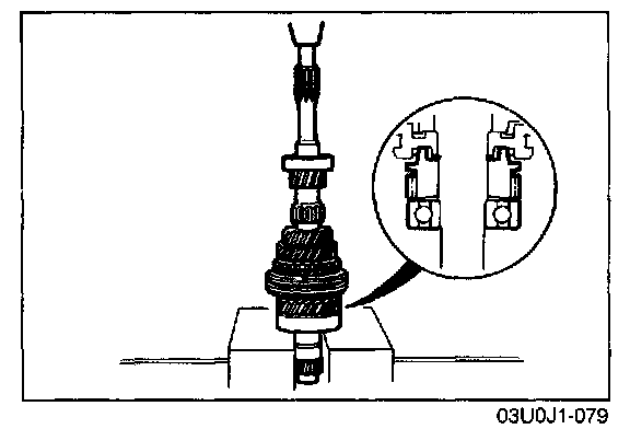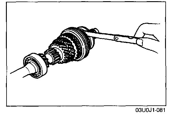 1. Turn the primary shaft over and install the 3rd gear, synchronizer ring (3rd), and clutch hub assembly (3rd/4th) with a press.