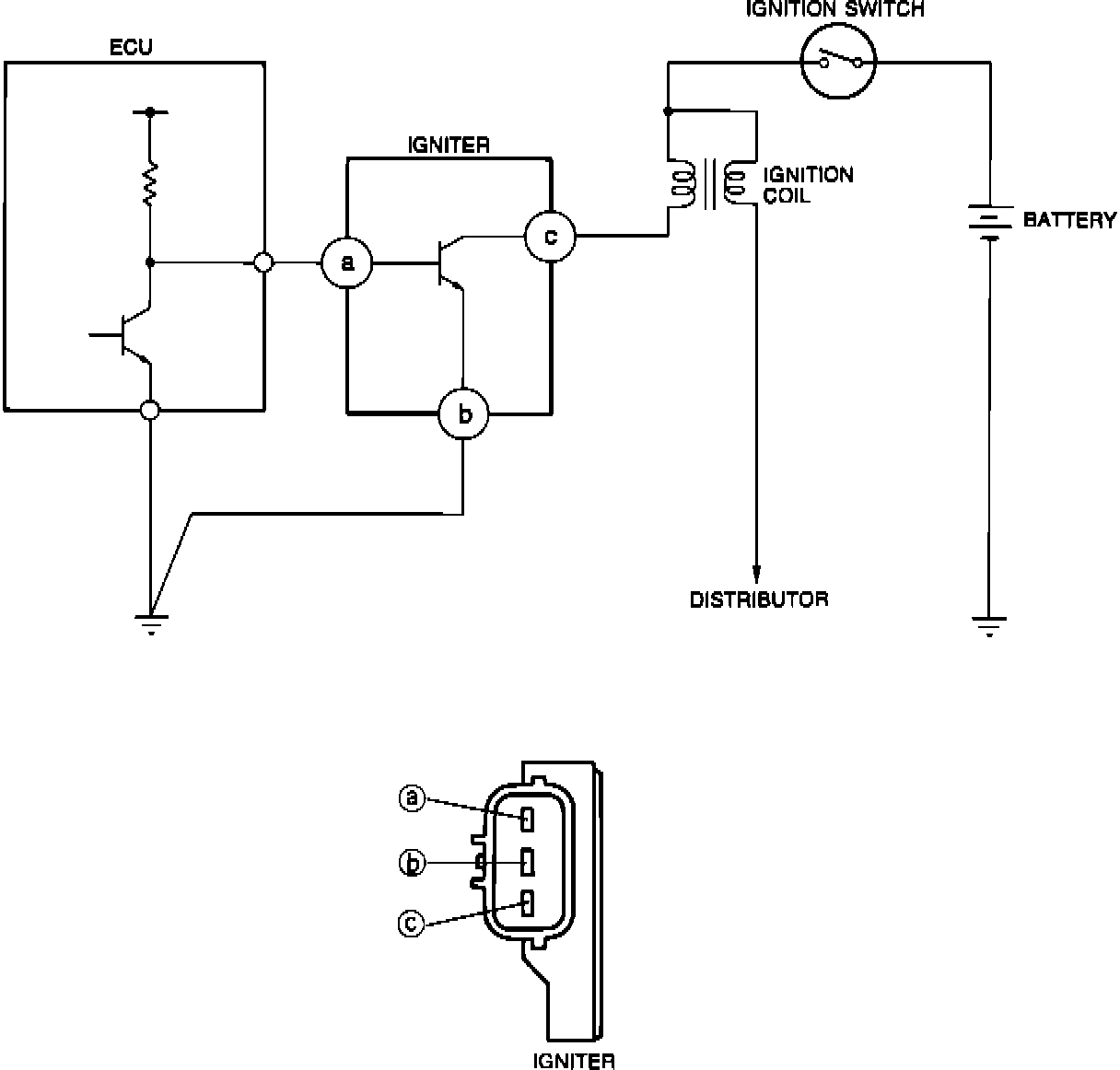 An ECU controlled igniter is used as a switch to regulate current flow through the coil primary circuit. Each time current flow is interrupted, high voltage is induced in the coil secondary windings to fire the spark plugs. Except for the initial setting, timing is determined by the ECU.