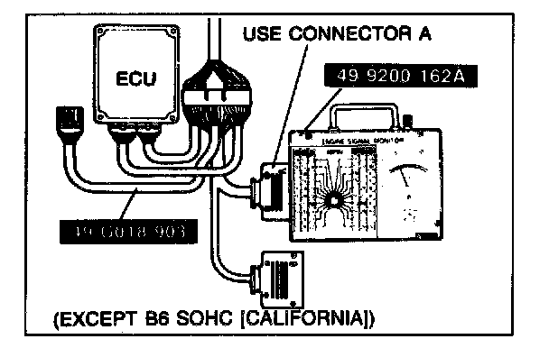 2. Connect the Engine Signal Monitor (49 9200 162A) and Adapter Harness [(49 G018 903): except B6 SOHC (California)], [(49 D019 902): B6 SOHC (California)] to the EC-AT control unit as shown.