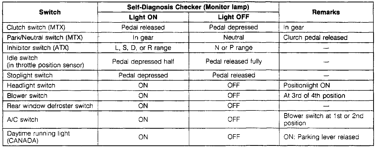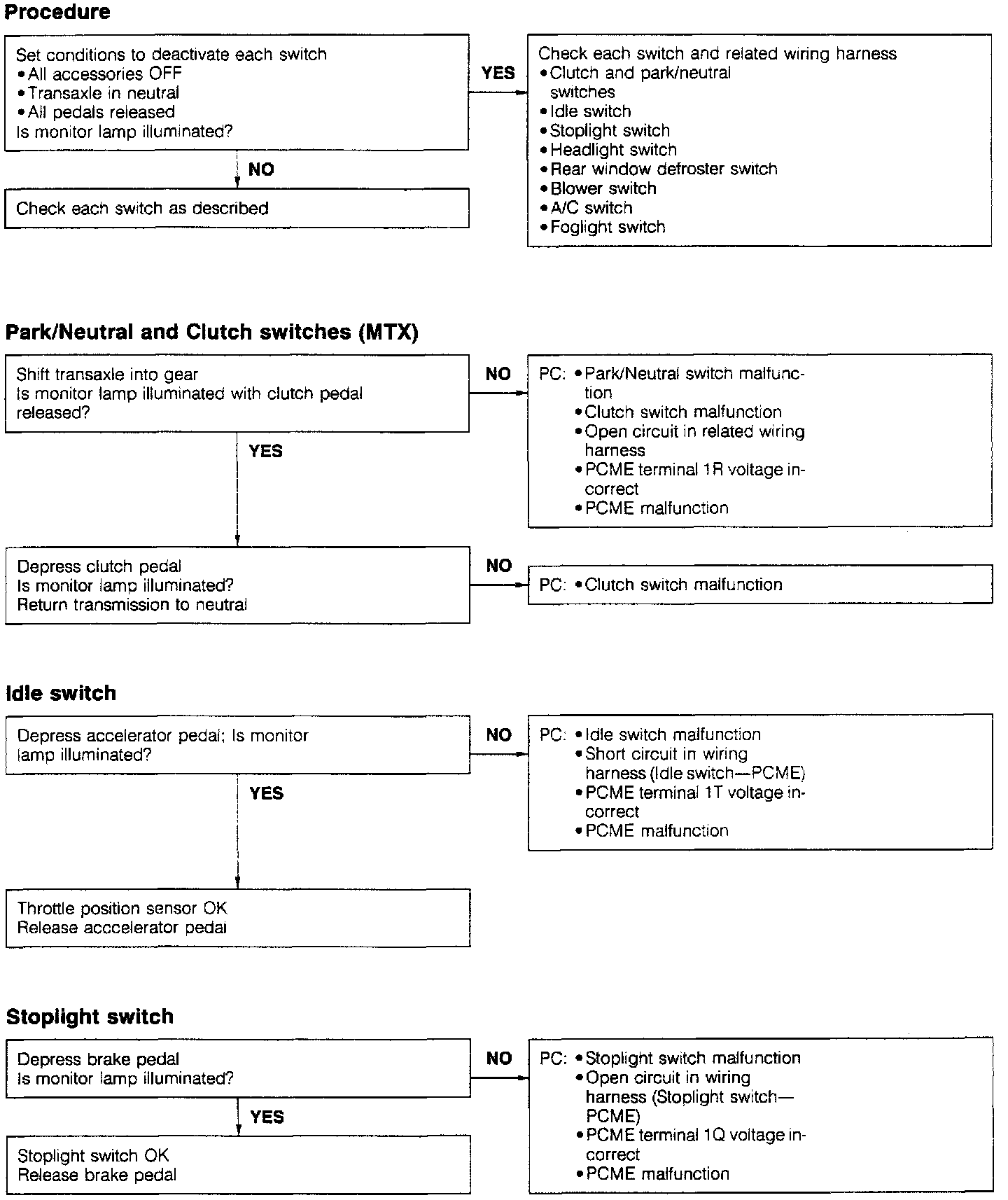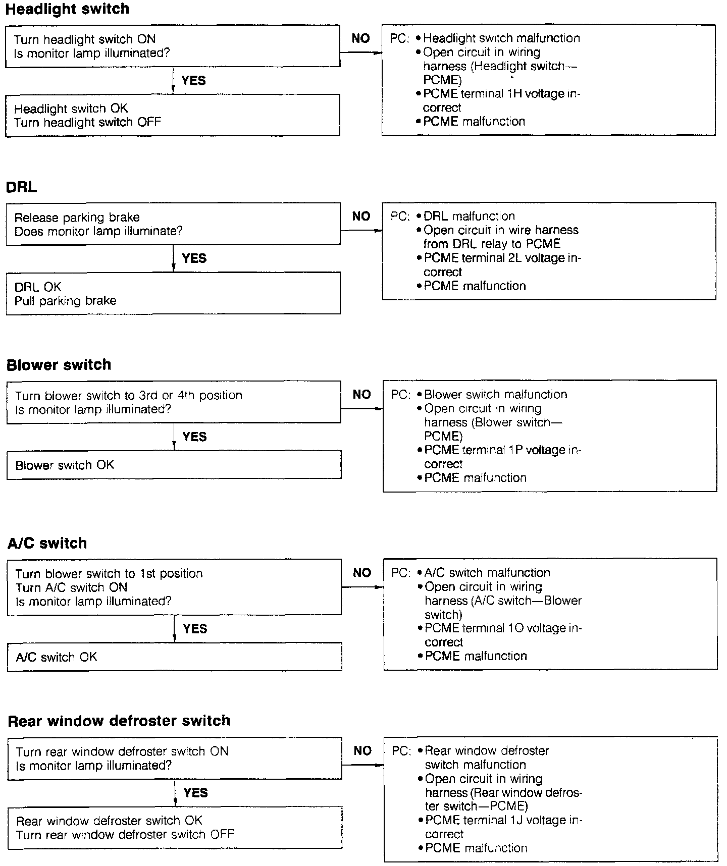 7. Check if monitor lamp illuminates when each switch is made to function as described on image chart: