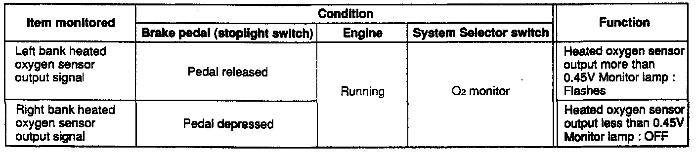 With System Selector test switch set to "02 Monitor," the two heated oxygen sensors are monitored as described on image chart. For equipment hook-up, refer to Switch Monitor Function.