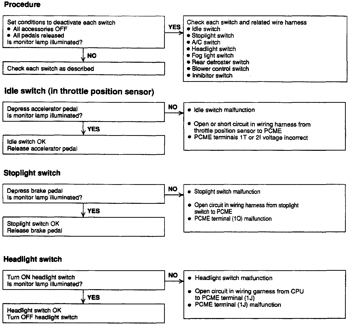 7. Check if monitor lamp illuminates when each switch is made to function as described on image chart: