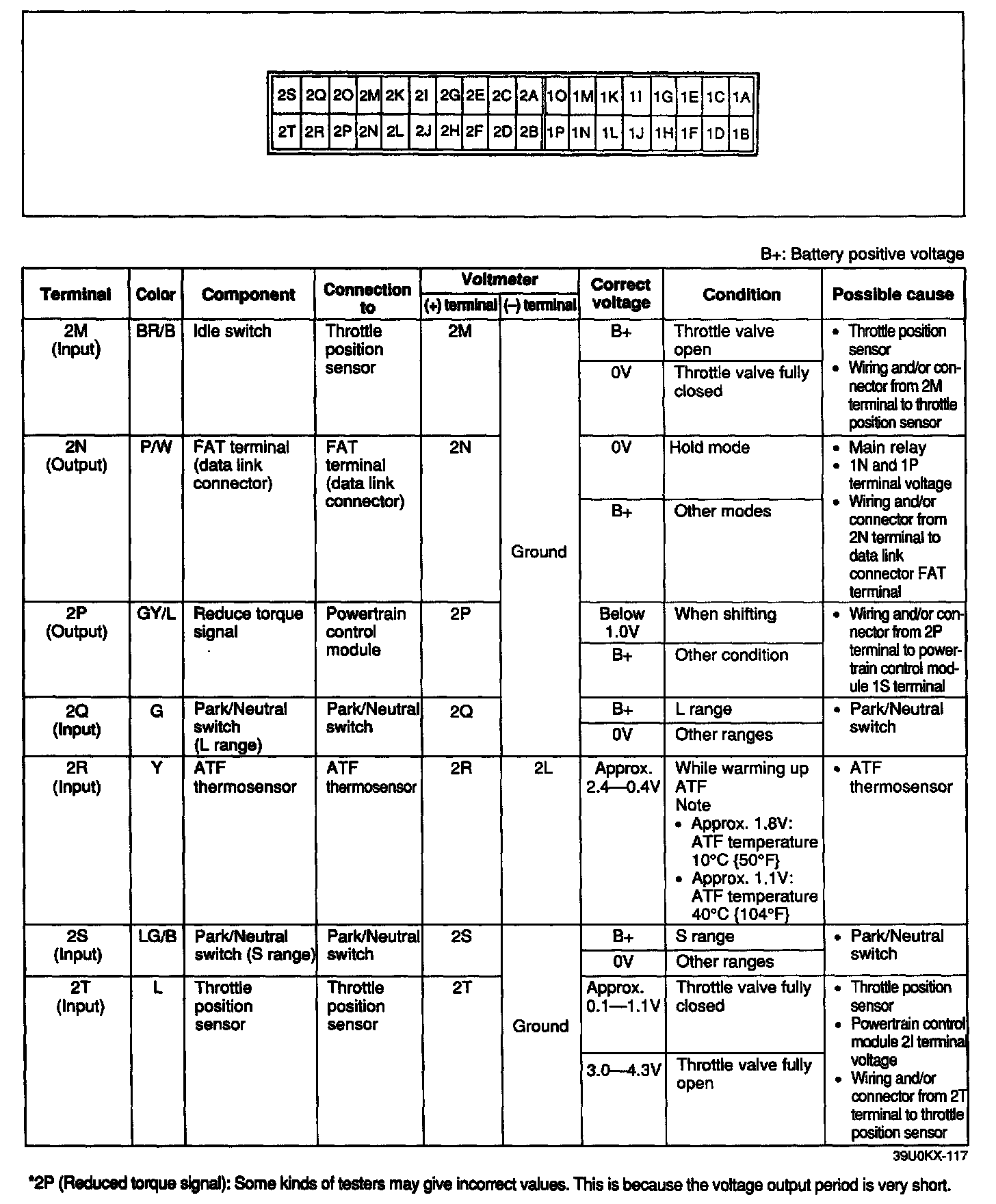 CAUTION: The 1 D terminal voltage [solenoid valve (shift A)] is below 1.0 V when in HOLD mode in P, R, and N ranges.
