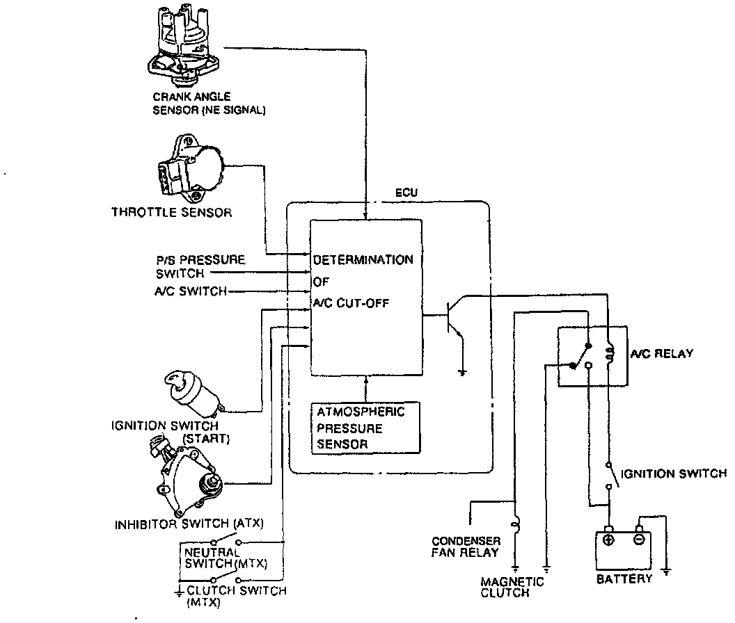 The ECU cuts A/C system operation at specified times to improve starting, improve idle smoothness just after starting, improve driveability and acceleration performance, and to prevent engine overheating.